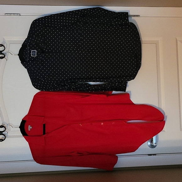 Two blouse combo. The red one is a medium while the navy blue polka dot one is a small (or a tight fitted medium in my opinion).