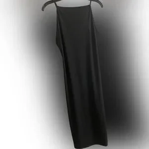 Black midi ribbed bodycon dress. Thin fabric with a split at the back and adjustable straps