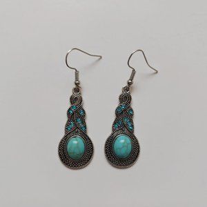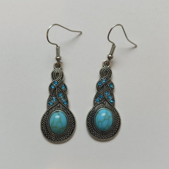 The listings price includes both pairs of earring. These earrings are new without tags. The pair on the left are vintage style tribal drop earrings and the pair pictured on the right are rhinestone decor earrings. Both are tuquoise/teal blue in color.