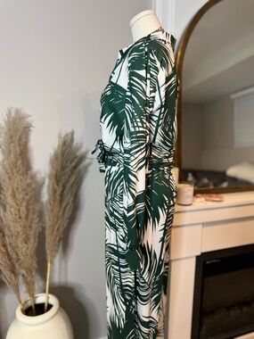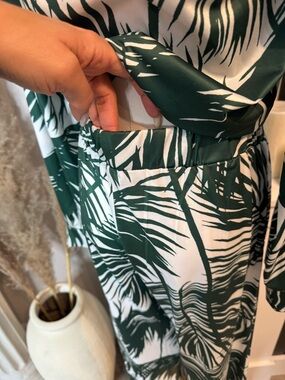 Flowy pants and tie shirt with bold palm leaf print. Tie waist accents the silhouette. Fresh green and white colorway. Effortless, tropical-inspired style.