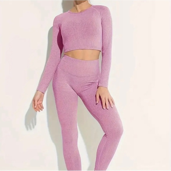 Two-Piece Pink Ribbed Long Sleeve and Leggings Work Out Active Gym Set