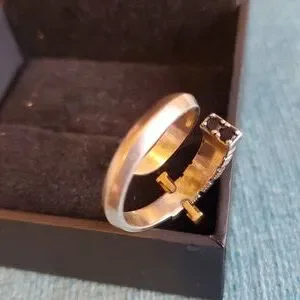 Set of two contemporary stackable rings. One ring features a matte 925 silver band. The second ring has gold-tone accents and textured detailing. Sleek, modern look. Perfect for everyday wear.