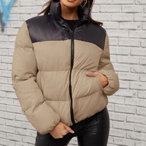 Stay warm and stylish with this two-tone puffer jacket. Featuring a chic black and tan design, it's perfect for any casual outing.