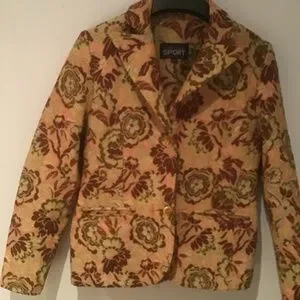 Floral print with two front pockets. Seams are bound and upper half of jacket is self lined. Sleeve from back of neck: 33”. Back length from neck to hem: 25”. Size fits like a small medium.