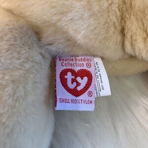 Adorable plush dog toy by Ty. Soft cream body with black accents. Ideal for play and cuddles.
