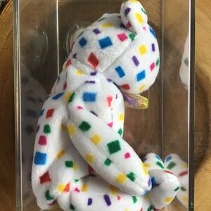 This little one is so sweet! Confetti colors adorn this bears body signifying the celebration of the new millennium, the year 2000! He comes in an acrylic see through box for you to display in his new living home!