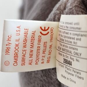 Adorable gray rhino plush from TY Beanie Babies. Features soft gray fur with brown accents.