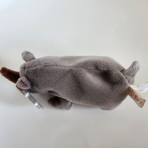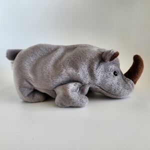 Adorable gray rhino plush from TY Beanie Babies. Features soft gray fur with brown accents.