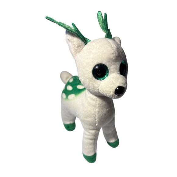 A charming collectible plush deer with glittery green accents, soft white fur, and vibrant green polka-dotted details. Ideal for display or gifting.