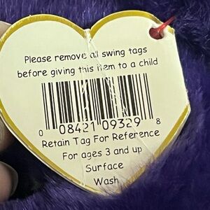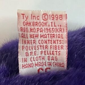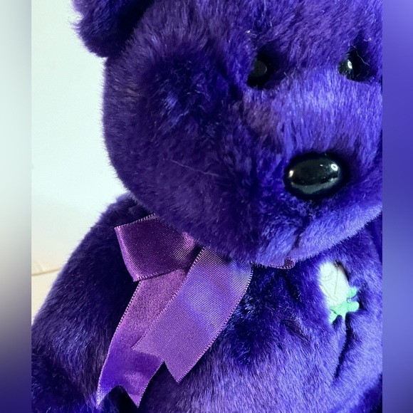 This Ty Beanie Buddies Princess Diana Bear is a stunning collectible in rich purple plush. Featuring a white rose embroidered on its chest and a satin purple ribbon around its neck, this iconic bear was created to honor Princess Diana and benefit her memorial fund. It comes with its original heart-shaped hang tag, detailing the charitable purpose behind its creation. Perfect for collectors or as a thoughtful gift.