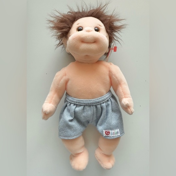 Adorable Ty Gear plush toy wearing blue striped shorts. Perfect for collectors or as a gift.