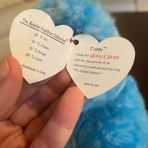 Classy is a bright blue bear covered in a swirly pattern. He has black button eyes and a larger black button nose. He wears a blue ribbon tied around his neck and a badge on the left side of his chest with a number “1” on it.