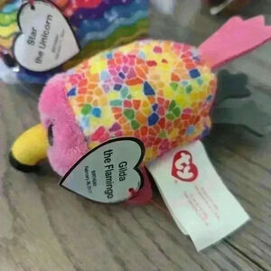 squishy Helena preowned in great condition. New Gilda the Flamingo, Star the Unicorn, Finley the Fox + Bat, Bull, and Kirin Beanie.