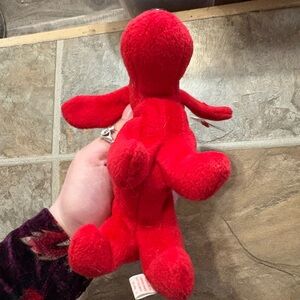 Cute red plush dog with floppy ears. Soft, velvety fabric and embroidered eyes. Small black plastic nose. Great as a gift or shelf accent.