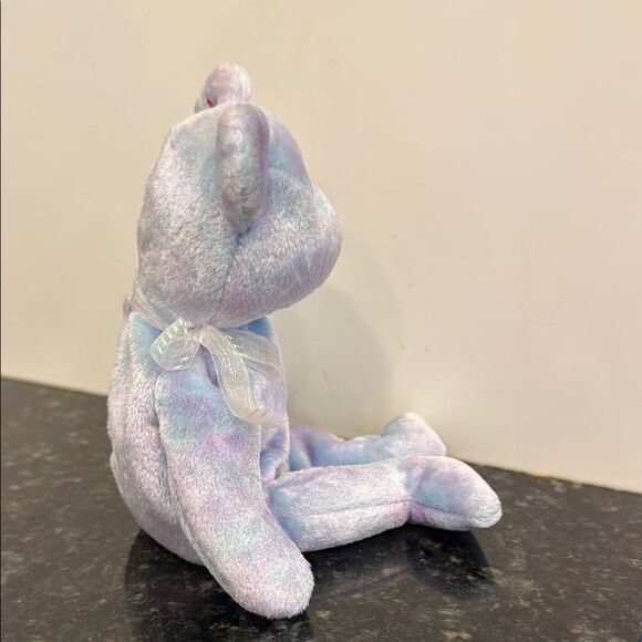 Ty Issy Bear Plush Stuffed Animal Beanie Babies 8” Four Seasons Hotel Bear . This charming Ty stuffed animal bear showcases a delightful blend of purple and blue hues, crafted with the brand's signature plush material. Its classic pose and soft texture make it perfect for cuddling and display. The bear retains its original Ty heart-shaped tag, ensuring authenticity and collectible value.