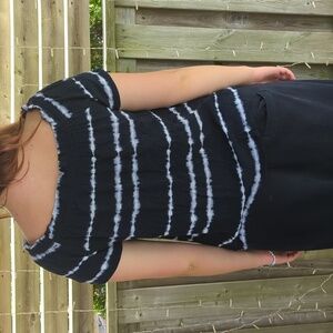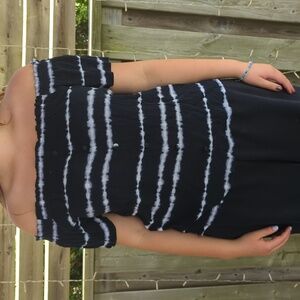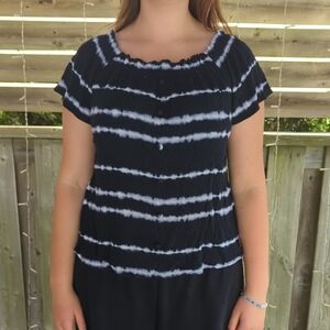 Fun, flexible summer top can be worn on or off the shoulder. Made of a crinkle polyester fabric. Features decorative buttons down a faux front.