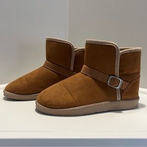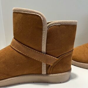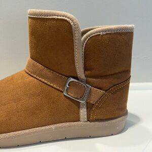 New condition. Manmade materials - faux suede outer & faux fir lining. Rubber sole. Accent buckle.