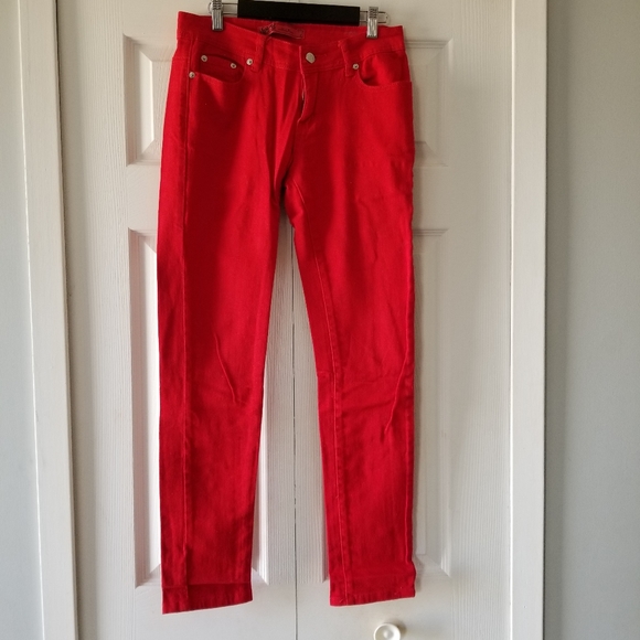 Bright red colored jeans size 7/8 by U51. Please not they have 2 tiny spots that can possibly be removed( photo #5).