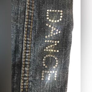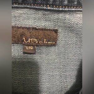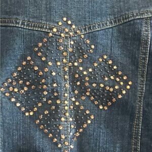 Trendy Y2K UB Jeans cropped denim jacket in excellent condition. Women’s size large. Features rhinestones spelling ‘Dance’ down the left sleeve and beaded diamond pattern on the back. Four-button front closure, two zippered chest pockets, and four-button cuffs. No missing embellishments. Made from 98% cotton and 2% spandex for slight stretch. From a smoke-free home.