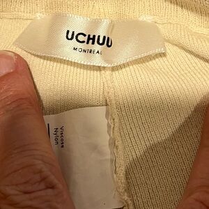 Elegant and soft beige knit pants by UCHUU. Wide-leg silhouette with stretchy waistband and small side slits for added comfort and movement. No size tag — estimated size S/M based on measurements. Perfect for minimalist wardrobes, lounging, or dressing up with a structured top.