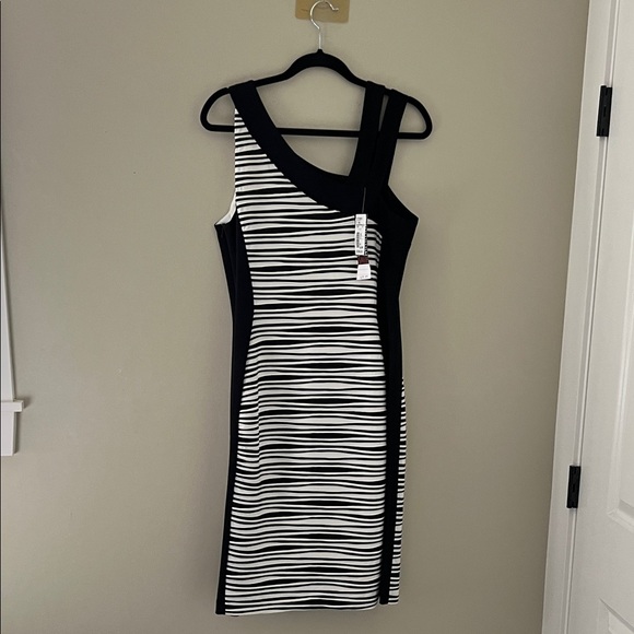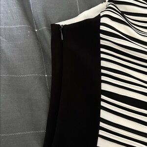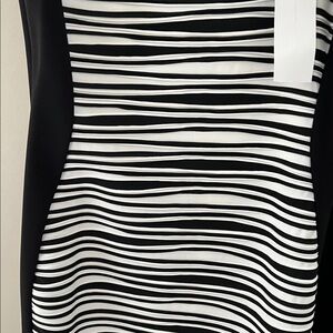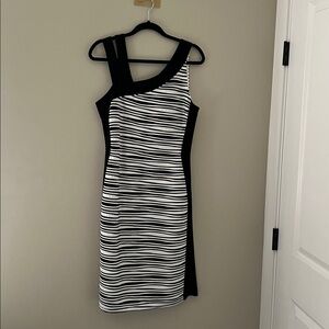 Elegant black and white striped dress perfect for any occasion. Features a stylish asymmetrical neckline for a modern look. It’s brand new never been worn before, pit to pit is 17 1/4 inches top to bottom is 41 inches and shoulder width is 14 5/8 inches