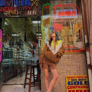 Faux-fur jacket styled with an easy front zip and handy front pockets