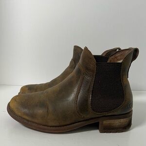 Rugged brown leather boots with side elastic panels. Ideal for everyday wear. These boots will ship as shown in the photos. These are a preowned item with normal signs of wear. All offers welcome! Thanks for looking
