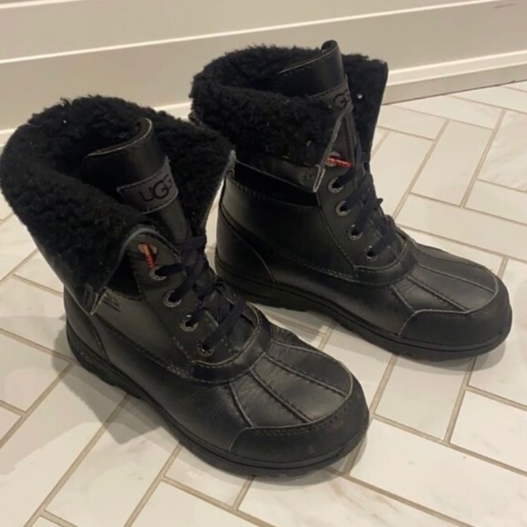 Ugg black boots Kids size 1 Leather Retail for 170$ Lots of life left. Scuffs on front toes Not visible - only up close See pictures