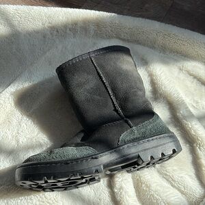 Slip into iconic comfort with these UGG Classic Short Boots, size 8, in worn condition. Featuring a charcoal suede upper, signature shearling lining, and a rugged rubber outsole, these boots deliver timeless warmth and style for chilly days.