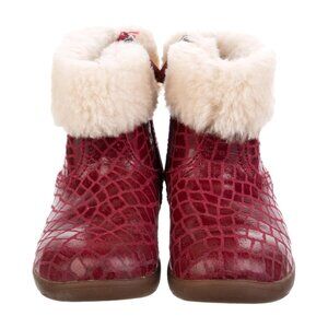 Toddler Kids' burgundy UGG Winter boots with rounded toes, rubber soles, shearling trim and zip closure at the sides. EU 23.5 Includes box.