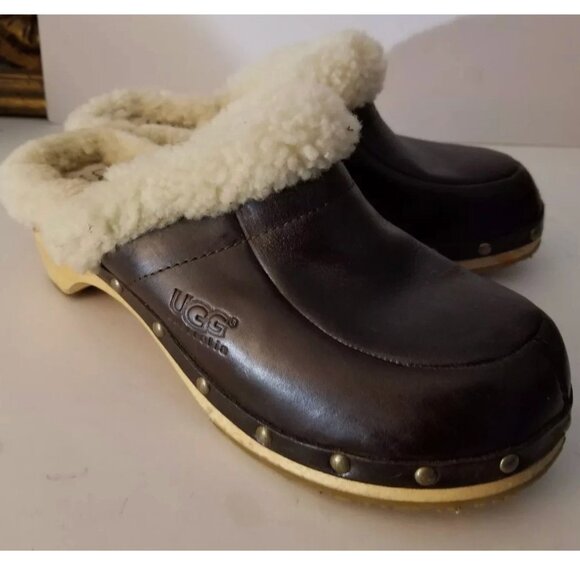 Ugg Clogs Brown Shearling Lined Leather With Wood Sole Size 9 Women's Studded Mule