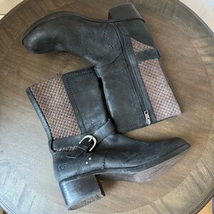 UGG boots with mid-calf height, decorative side buckle, and textured inlay. Features a block heel, inner zipper, and classic UGG comfort. Wool-blend lining inside for warmth without bulk. These are NOT your basic UGGs—perfect for dressing up or down!