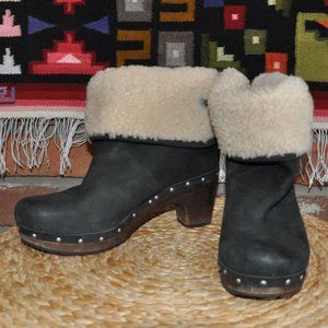UGG Lynnea Black Nubuck Leather Fold Down Ankle Bootie Shearling Clog Boot 8