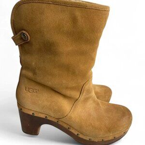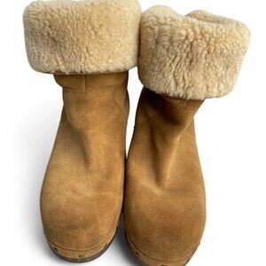 UGG Lynnea Fold Over Brown Leather Shearling Cuff Clog Boots 3204 Women's 8