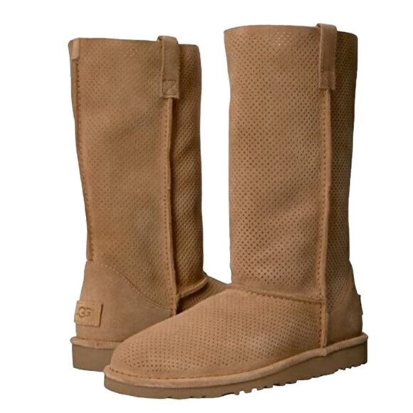 UGG NEW Classic Unlined Perforated Leather Tan Tall Boots Suede Minimalist