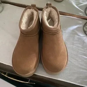 Embrace the cold season with UGG's tan winter boots, featuring a modern platform sole and a cozy suede upper. These slip-on boots offer a minimalist design with a rounded toe, perfect for keeping your feet warm and stylish during winter and spooky season!