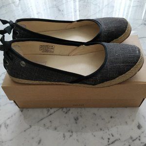 Feminine ribbon charms the lace-up back of an espadrille-inspired flat.