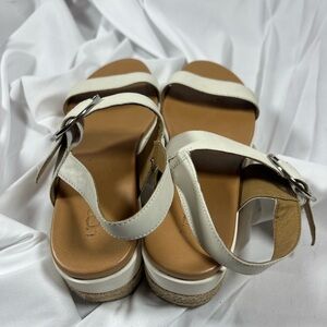 Experience the perfect blend of style and comfort with these UGG sandals, featuring a chic white and tan color scheme. The sandals boast wide front straps and sleek ankle straps with eye-catching silver buckles, all set on a light tan sole. Ideal for casual outings, these sandals offer a sophisticated open-toe design and are crafted from high-quality materials for lasting wear.