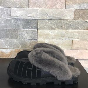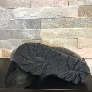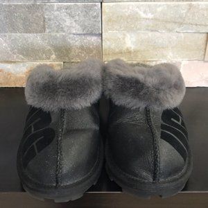 Plush genuine shearling shearling trim and lining add cozy warmth to a glitter-dusted slipper made from lush suede and set on a traction-enhanced EVA sole.