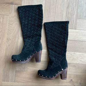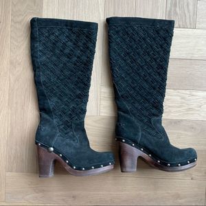 Seamlessly blending UGG® comfort and design, these clog-inspired boots blaze a fashion path without compromising the feet. Traction rubber bottoms and strategic sheepskin lining keep the heeled design cushy and stable, while a basket-weave suede upper and bass wood outsole provide style enough for any occasion.