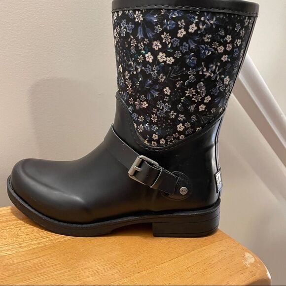 These waterproof rain boots come in a deep navy shade, featuring a beautifully detailed blue and white floral print on the upper. A stylish buckle detail adds a refined touch, while the soft sheepskin soles provide signature UGG comfort. Designed for practicality and elegance, they are in excellent condition with no flaws. Perfect for autumn and fall rain showers!