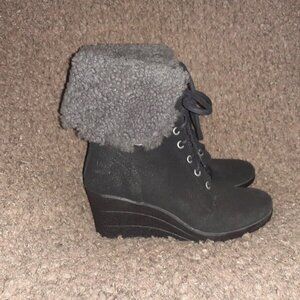 UGG-Zea-Black Suede Leather Shearling Wedge Lace-Up Boots-Sz 36