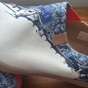 Stylish slip-on shoes with a vibrant blue and orange design. Comfortable and unique. A true footwear masterpiece that will have you looking chic and unique.