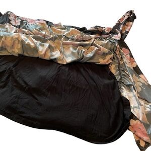 Elegant black dress with pink floral patterns, perfect for any occasion. Features a flowing design for a flattering fit.