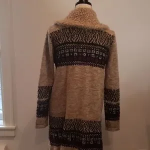 EUC no flaws to note, no snags, holes, stains, pillong etc. Loose thread style in the patterned sections. So warm, unique and beautiful on. Snap button close. High collar option.