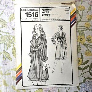Unused, uncut vintage 1980s sewing pattern, ruffled wrap dress.