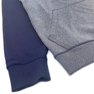Featuring the Axemen Hockey logo from Acadia University in Nova Scotia, this soft, sporty hoodie combines warmth and team spirit in one classic look. Features cozy fleece interior, raglan sleeves for ease of movement, and front kangaroo pocket for comfort and function. Size: Men’s Medium (underarm to underarm 22"; length 29"; sleeve length from underarm seam 22"). Colour: Gray body with navy hood and sleeves. Material: 100% Polyester. EXCELLENT pre-owned condition with minimal wear.