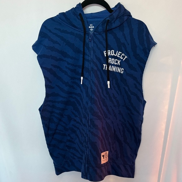 Bold blue sleeveless hoodie. Features black drawstrings. Project Rock Training graphic on chest.
