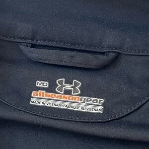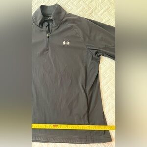 In great used condition. Under Armour. Adult medium. 100% polyester. Black in colour with white embroidered stitched UA logo on front. 1/4 zip long sleeved weather-resistant black jacket top. Lightweight. Used a few times while golfing on cooler mornings. Could easily be unisex. There is no fading, was just the lighting when I put the item layflat for measurements. All measurements are approximate.