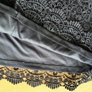 Uniqlo high quality black lace fabric over soft black lining, concealed zipper at back, scalloped hem. Worn once for Uniqlo fashion event in Tokyo, like new. Japanese size M which fits small but the fitted skirt has some ‘stretch/give’ for ease of movement and comfort. Unstretched lying flat measurements: Waist 13 in., Hips 18 in., Length 23 ¾ in. Looks great as is, or emphasize lace by shortening hem of lining! Great for day and evening wear.